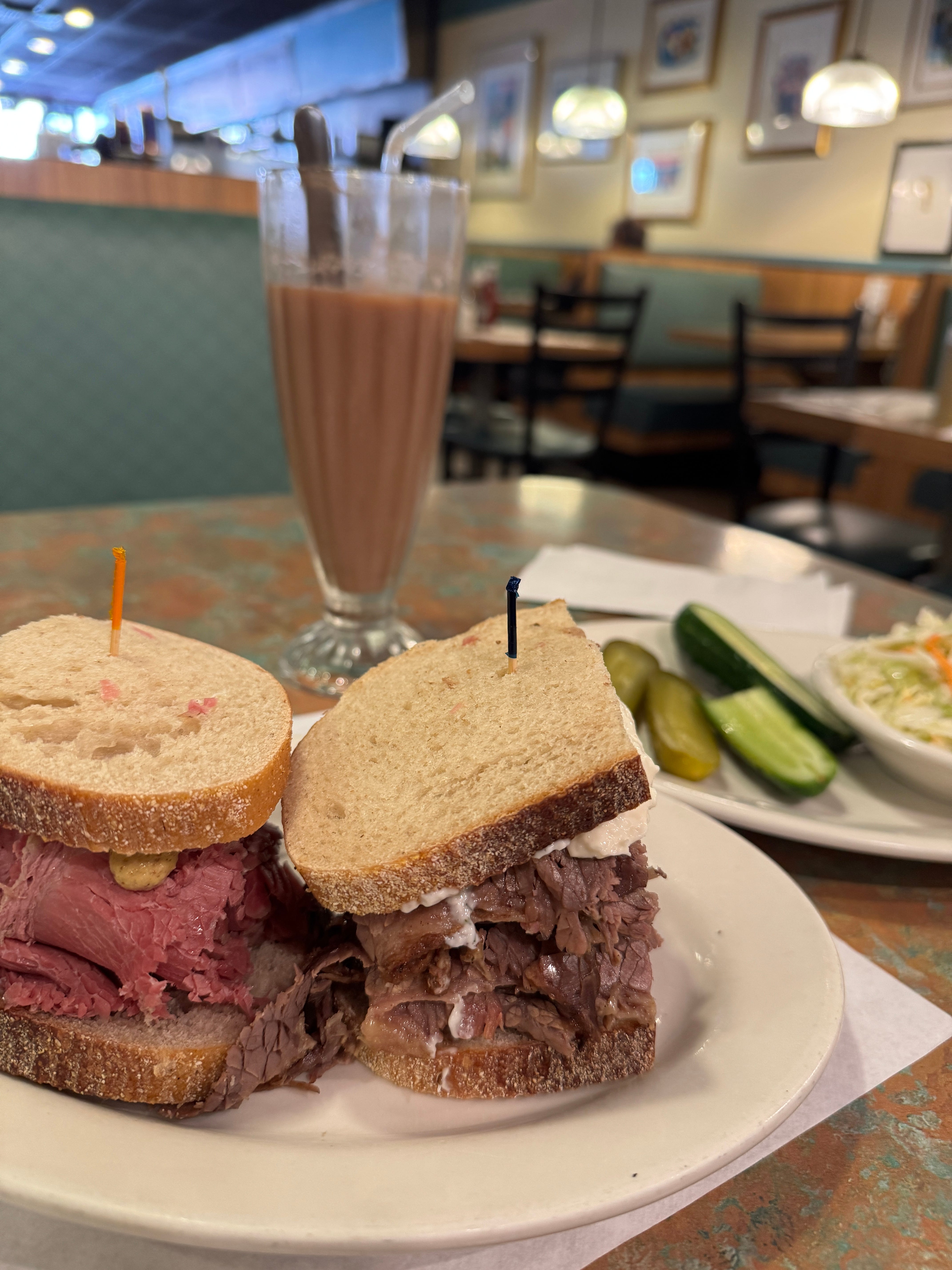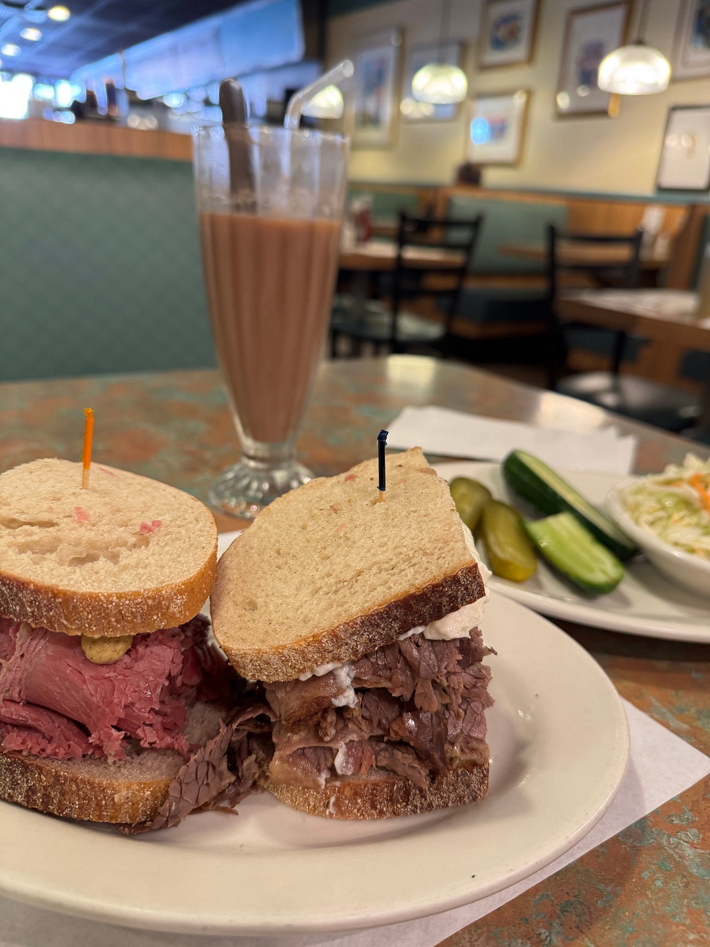 Liebman’s has all of the usual suspects on their menu - pastrami, frankfurters, latkes, knishes, and all manner of smoked fish. I was really happy to see that they had a sandwich combo section in which you could get a half and half sandwich with two meats; I opted for half brisket (w/ horseradish aioli) and half pastrami (w/ mustard) and of course my meal came with pickles and coleslaw. My egg cream arrived first, followed by my pickle/coleslaw plate shortly after. They make their egg creams with oat milk here, which my tummy appreciated, and it was very good - great fizziness, correct amount of chocolate U-Bet syrup, chef’s kiss. I also surprisingly enjoyed the coleslaw! I’m not a coleslaw girlie because I hate mayonnaise, but this one was actually quite light on the mayo and super crunchy. The pickle selection was Kosher dill and half-sour and I was surprised again that the half-sour was my fave as I’m usually down with dill.